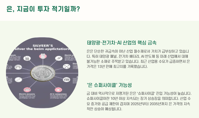 - 은은 단순한 귀금속이 아닙니다. 산업 필수재 + 투자처로서 가치를 모두 갖춘 자산입니다.