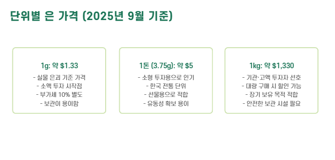 단위별 은 가격(2025년 9월 기준)