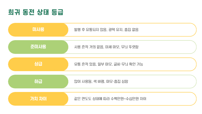 동전 가치는 발행 연도뿐 아니라 보관 상태(등급)에 따라 크게 달라집니다.