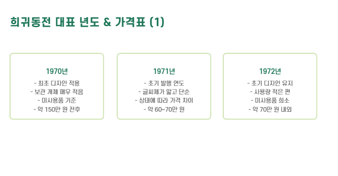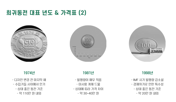 - 특히 1970, 1971, 1972, 1974년, 그리고 발행량 적은 1981년, 1998년이 희귀합니다.