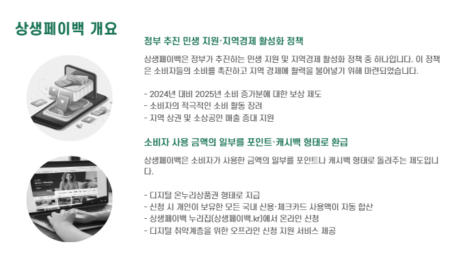 상생페이백은 정부가 추진하는 민생 지원·지역경제 활성화 정책 중 하나로, 소비자가 사용한 금액의 일부를 포인트·캐시백 형태로 돌려주는 제도입니다.
